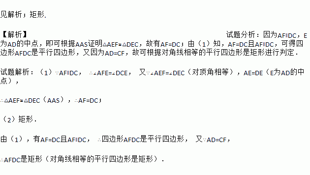 见解析;矩形. 【解析】试题分析:因为AF∥DC,E为AD的中点,即可根据AAS证明△AEF≌△DEC,故有AF=DC;由(1)知,AF=DC且AF∥DC,可得四边形AFDC是平行四边形,又因为AD=CF,故可根据对角线相等的平行四边形是矩形进行判定. 试题解析:(1)∵AF∥DC, ∴∠AFE=∠DCE, 又∵∠AEF=∠DEC(对顶角相等),AE=DE(E为AD的中点), ∴...