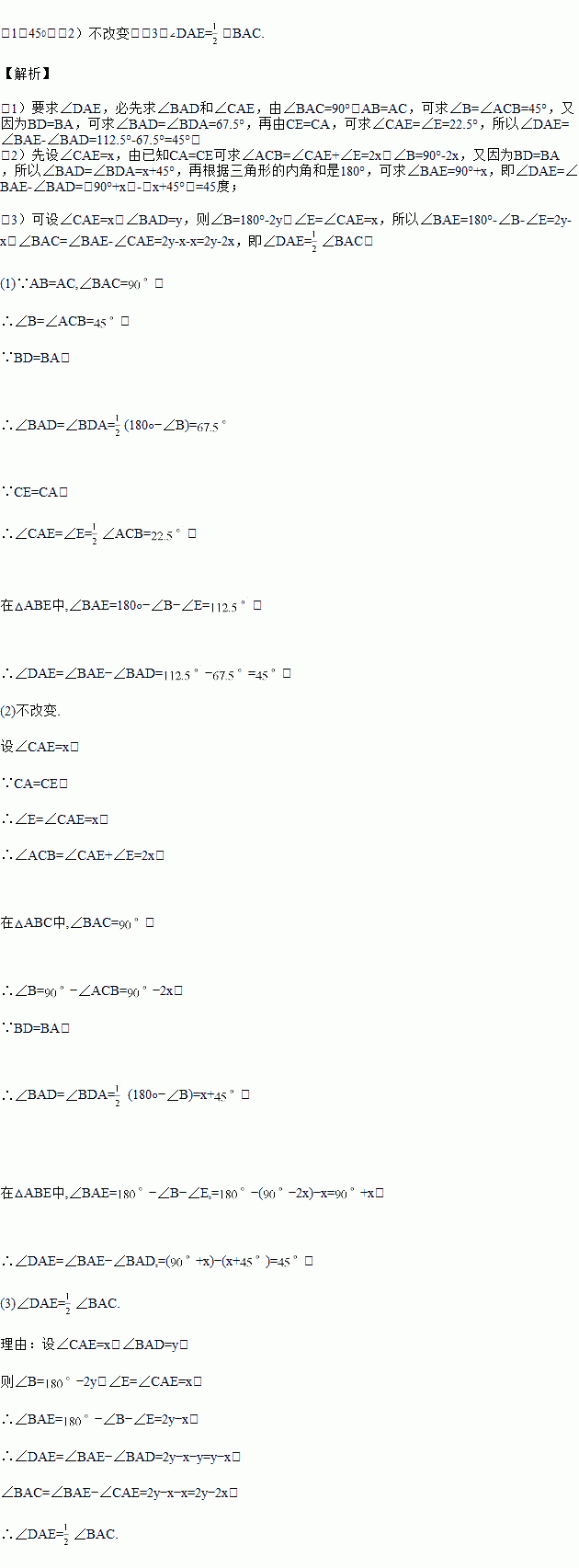(1)如图,在在△ABC中,已知∠BAC=900,AB=AC,点D在BC上,且BD=BA,点E在BC的延长线上,CE=CA,求∠DAE的度数;