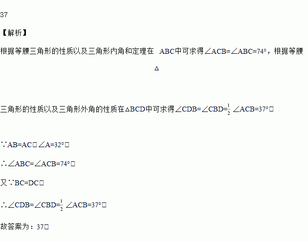 如图,在△ABC中,AB=AC.以点C为圆心,以CB长为半径作圆弧,交AC的延长线于点D,连结BD.若∠A=32°,则∠CDB的大小为_____度.