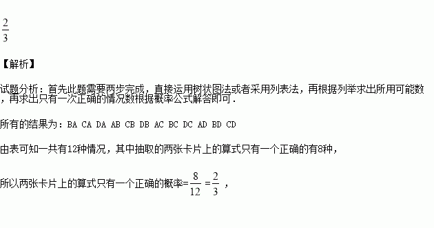 如图,有四张卡片(形状、大小和质地都相同),正面分别写有字母A、B、C、D和一个不同的算式,将这四张卡片背面向上洗匀,从中随机抽取两张卡片,这两张卡片上的算式只有一个正确的概率是 .