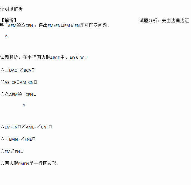 如图,在?ABCD中,点E,F分别在边AD,BC上,点M,N在对角线AC上,且AE=CF,AM=CN,求证:四边形EMFN是平行四边形.