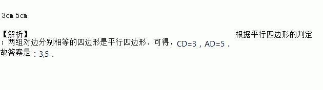 在四边形ABCD中,AB=3 cm,BC=5 cm,那么当DC=______,AD=______时,四边形ABCD是平行四边形.