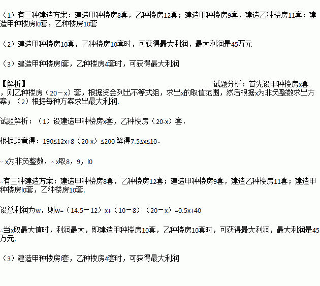 某农场的一个开发商准备开发建设甲、乙两种户型的楼房,甲种楼房每套造价12万元,售价14.5万元;乙种楼房每套造价8万元,售价10万元,且它们的造价和售价始终不变.现准备建造甲、乙两种楼房共20套,所用资金不低于190万元,不高于200万元.