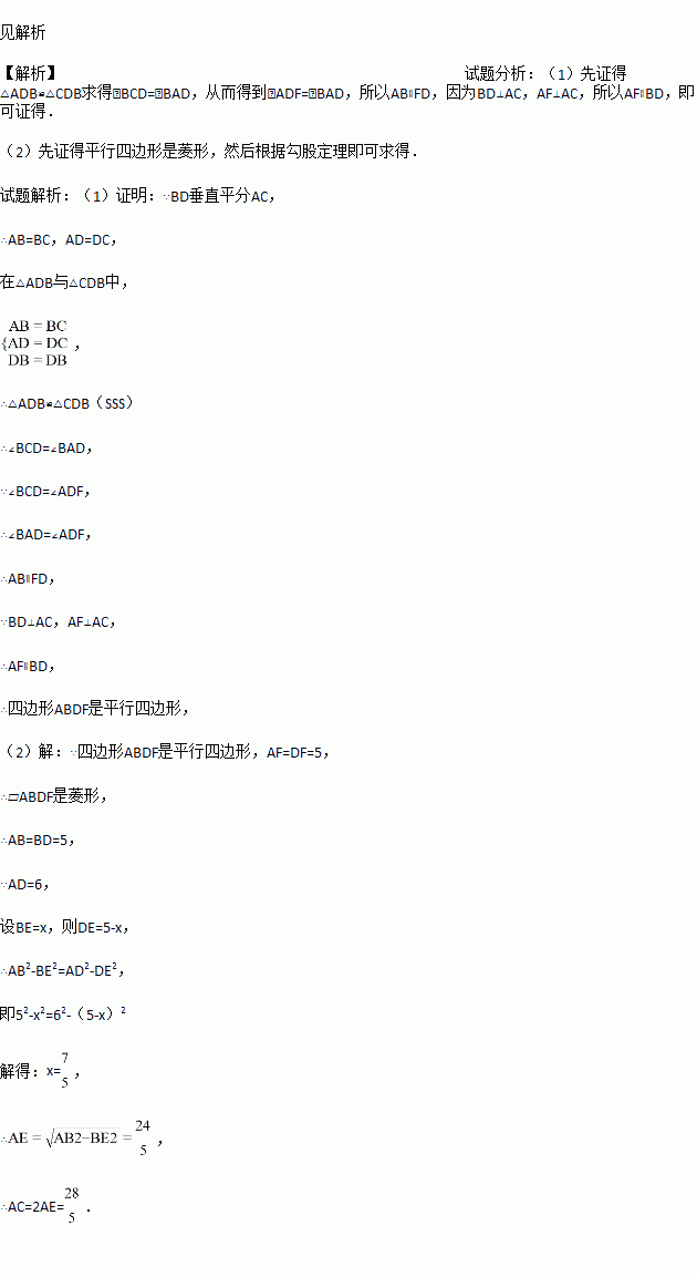 已知BD垂直平分AC,∠BCD=∠ADF,AF⊥AC,