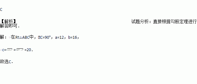 在Rt△ABC中,∠C=90°,a=12,b=16,则c的长为( )
