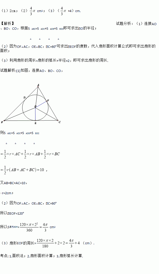 如图,已知⊙O分别切△ABC的三条边AB、BC、CA于点D、E、F,S△ABC=10cm2,C△ABC=10cm且∠C=60°.求: