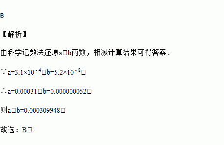 已知a=3.1×10﹣4,b=5.2×10﹣8,判断下列关于a﹣b之值的叙述何者正确?( )