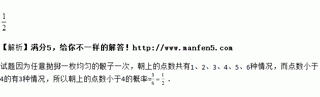 任意抛掷一枚均匀的骰子一次,朝上的点数小于的概率等于________.