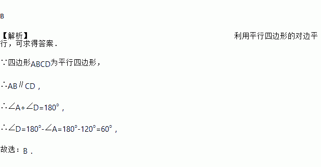 如图,在?ABCD中,∠A=120°,则∠D=( )