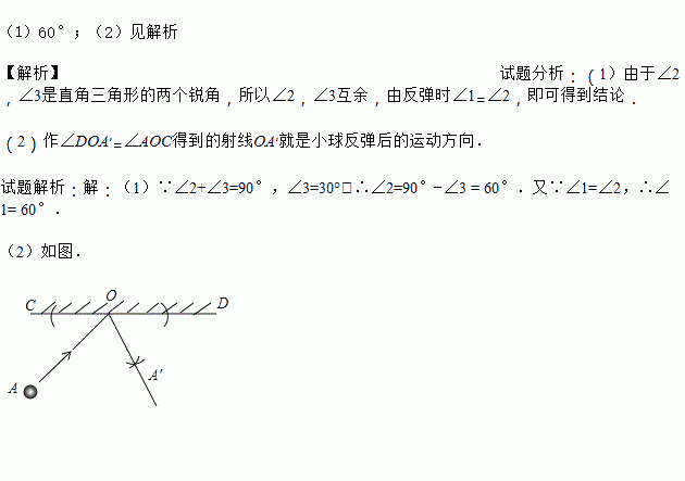 (1)如图所示,选择适当的方向击打白球,可以使白球 反弹后将黑球撞入袋中,此时∠1=∠2,并且∠2 +∠3=90°。如果∠3=30°,那么∠1应等于多少度,才能保证黑球直接入袋?