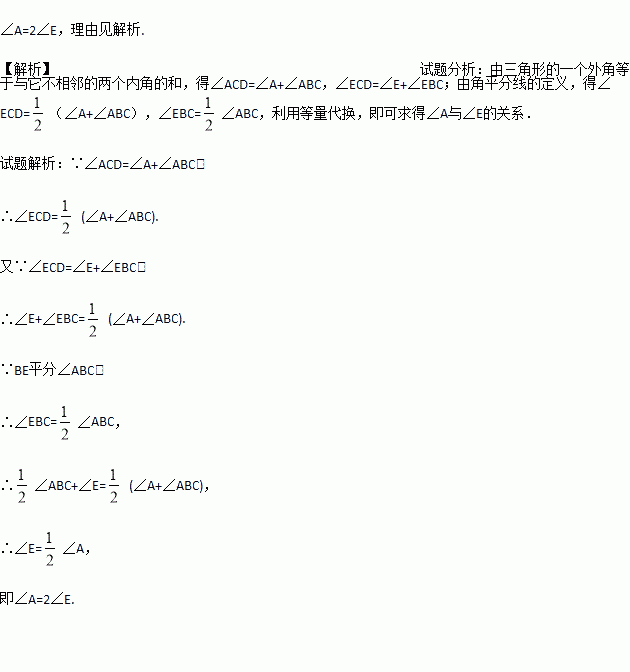 如图所示,∠ACD是△ABC的外角, BE平分∠ABC, CE平分∠ACD,且BE、CE交于点E。试找出∠A与∠E的关系。