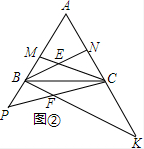 (2)如图②,把△BCE沿着BC向下翻折到△BCF,延长CF和BF交A于P,交AC于K,若等边△ABC的边长是10,求BP•CK的值.
