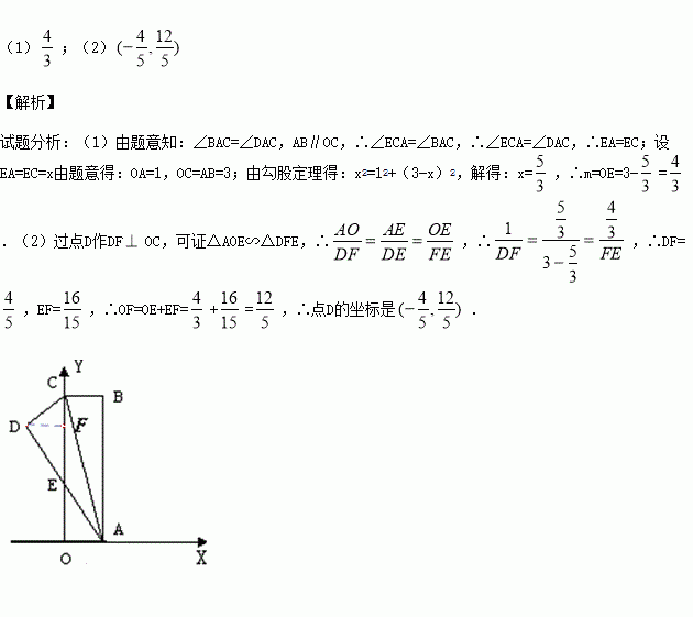 如图,在直角坐标系中,矩形ABCO的边OA在x轴上,CO在y轴上,点B的坐标是(1,3),将矩形沿对角线AC翻折,B点落在D点的位置,且AD交y轴于点E,若设OE =
