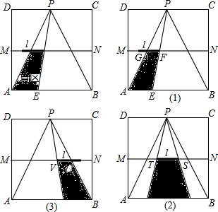 11.如图,正方形ABCD的边长为4,点M,N,P分别为AD,BC,CD的中点.现从点P观察线段AB,当长度为1的线段l(图中的黑粗线)以每秒1个单位长的速度沿线段MN从左向右运动时,l将阻挡部分观察视线,在△PAB区域内形成盲区.设l的右端点运动到M点的时刻为0,用t(秒)表示l的运动时间.(1)请你针对图(1)(2)(3)中l位于不同位置的情形分别画出在△PAB内相应的盲区,并在盲区内涂上阴影.