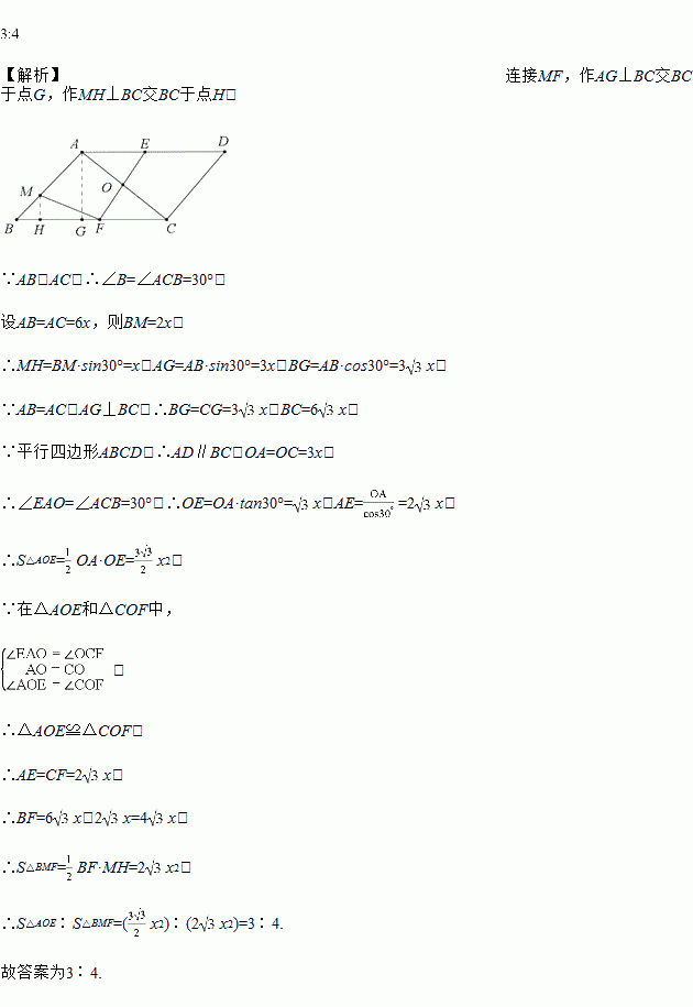 如图,在平行四边形ABCD中,∠B=30°,AB=AC,O是两条对角线的交点,过点O作AC的垂线分别交边AD,BC于点E,F;点M是边AB的一个三等分点。则△AOE与△BMF的面积比为_________.
