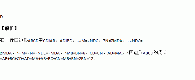 ÔÚ¡÷MNBÖУ¬BN=6£¬µãA£¬C£¬D·Ö±ðÔÚMB£¬NB£¬MNÉÏ£¬ËıßÐÎABCDΪƽÐÐËıßÐΣ¬ÇÒ¡ÏNDC=¡ÏMDA£¬ÔòËıßÐÎABCDµÄÖܳ¤ÊÇ£¨¡¡¡¡£©