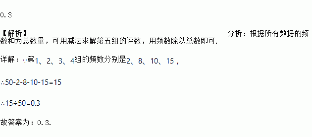将50个数据分成5组,第1、2、3、4组的频数分别是2、8、10、15,则第5组的频率为_________