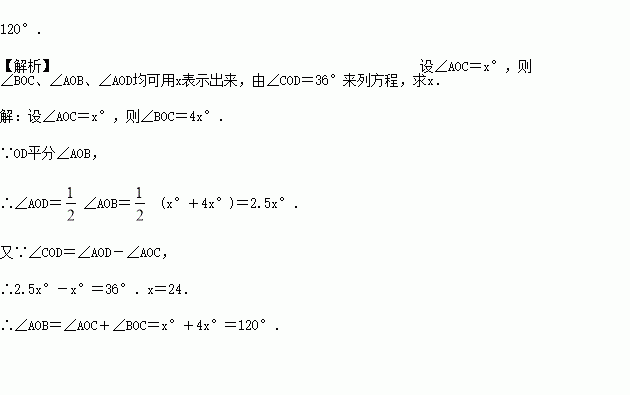 如图,已知∠AOC:∠BOC=1:4,OD平分∠AOB,且∠COD=36°,求∠AOB的度数.