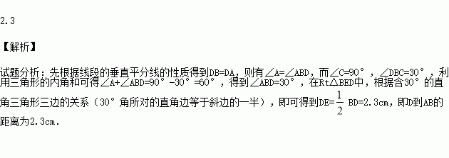 如图,在△ABC中,∠ACB=90°,AB的垂直平分线DE交AB于E,交AC于D,∠DBC=30°,BD=4.6,则D到AB的距离为 。