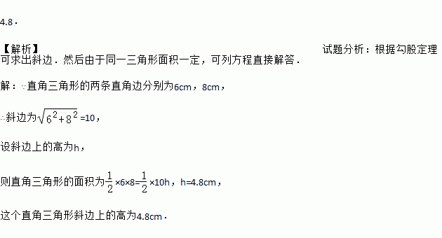 已知一个直角三角形的两条直角边分别为6cm,8cm,那么这个直角三角形斜边上的高为 cm.