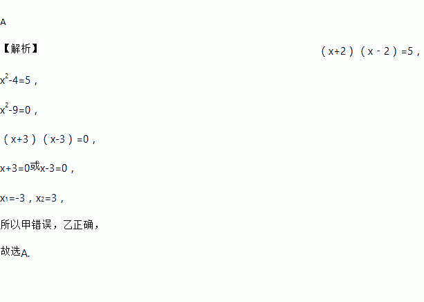 A 【解析】(x+2)(x﹣2)=5, x2-4=5, x2-9=0, (x+3)(x-3)=0, x+3=0或x-3=0, x1=-3,x2=3, 所以甲错误,乙正确, 故选A.