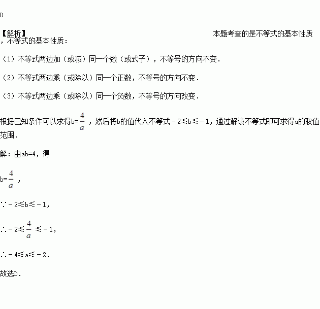 已知ab=4,若﹣2≤b≤﹣1,则a的取值范围是( )
