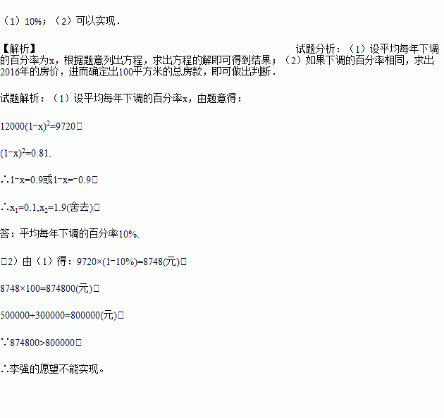 (2)假设2016年该楼盘的均价仍然下调相同的百分率,李强准备购买一套100平方米的住房,他持有现金30万元,可在银行贷款50万元,李强的愿望能否实现?(房价按照均价计算,不考虑其它因素.)