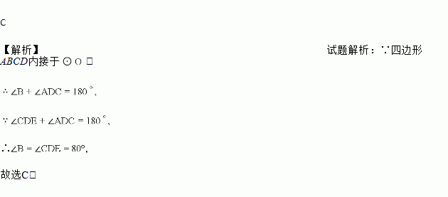 如图,四边形ABCD内接于⊙O,E为AD延长线上一点,若∠CDE=80°,则∠B等于( )