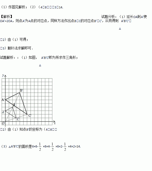 (1)在平面直角坐标系中作出△ABC以点O为位似中心,位似比为2的位似图形△A′B′C′;