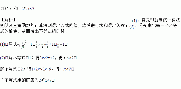 (1)计算:()-2 +(π-2)0-cos60º; (2)解不等式组.