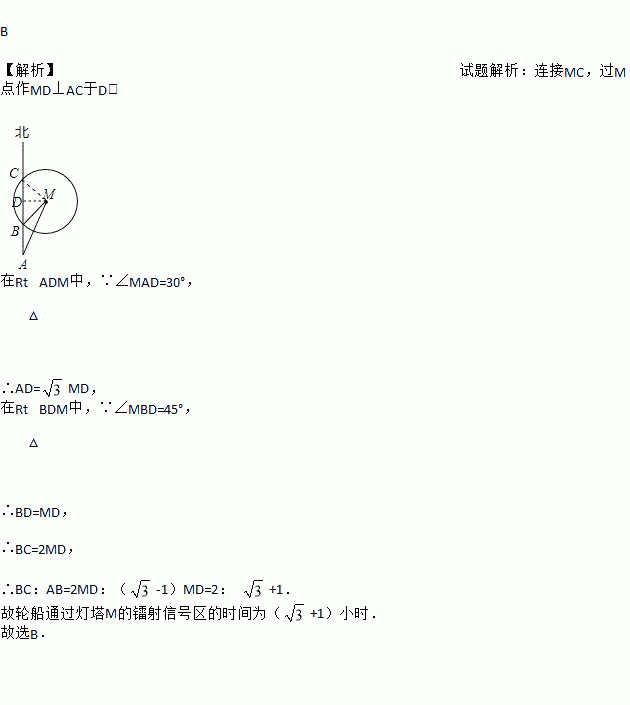 如图,已知灯塔M方圆一定范围内有镭射辅助信号,一艘轮船在海上从南向北方向以一定的速度匀速航行,轮船在A处测得灯塔M在北偏东30°方向,行驶1小时后到达B处,此时刚好进入灯塔M的镭射信号区,测得灯塔M在北偏东45°方向,则轮船通过灯塔M的镭射信号区的时间为( )