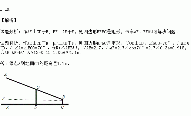 如图是某小区的一个健身器材,已知BC=0.15m,AB=2.70m,∠BOD=70°,求端点A到地面CD的距离(精确到0.1m).(参考数据:sin70°≈0.94,cos70°≈0.34,tan70°≈2.75)