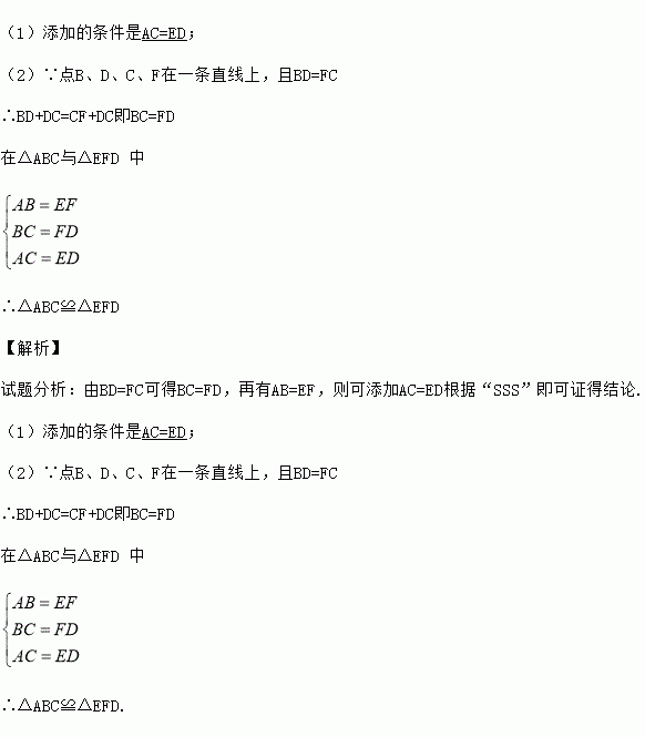 (1)添加的条件是AC=ED; (2)∵点B、D、C、F在一条直线上,且BD=FC ∴BD+DC=CF+DC即BC=FD 在△ABC与△EFD 中 ∴△ABC≌△EFD 【解析】 试题分析:由BD=FC可得BC=FD,再有AB=EF,则可添加AC=ED根据“SSS”即可证得结论. (1)添加的条件是AC=ED; (2)∵点B、D、C、F在一条直线上,...