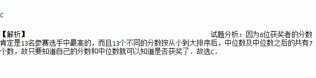 学校组织才艺表演比赛,前6名获奖.有13位同学参加比赛且他们所得的分数互不相同.某同学知道自己的比赛分数后,要判断自己能否获奖,在这13名同学成绩的统计量中只需知道一个量,它是( )