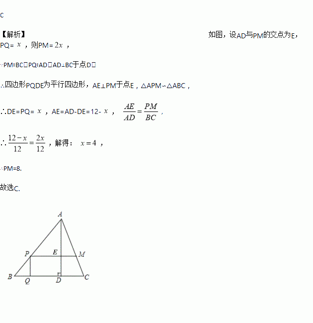 如图,在△ABC中,AD⊥BC于D,AD=BC=12,点P在AB上,且PQ∥AD交BC于点Q,PM∥BC交AC于点M,若PM=2PQ,则PM等于( )