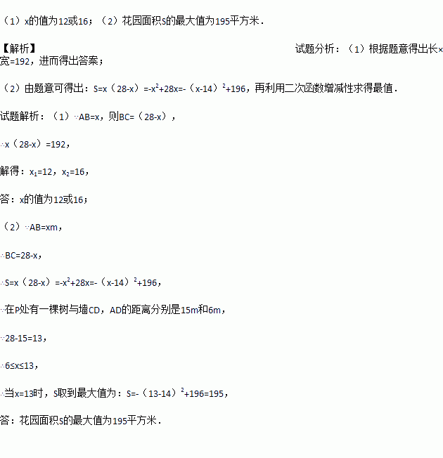 (2)若在P处有一棵树与墙CD,AD的距离分别是15m和6m,要将这棵树围在花园内(含边界,不考虑树的粗细),求x取何值时,花园面积S最大,并求出花园面积S的最大值.