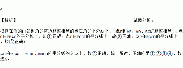 A 【解析】试题分析: 根据在角的内部到角的两边距离相等的点在角的平分线上.∵点P到AE、AD、BC的距离相等,∴点P在∠BAC的平分线上,故①正确;点P在∠CBE的平分线上,故②正确;点P在∠BCD的平分线上,故③正确; 点P在∠BAC,∠CBE,∠BCD的平分线的交点上,故④正确,综上所述,正确的是①②③④.故选A.