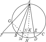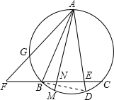 (3)作直径AH交BC于K,连接GH,由勾股定理可求得AK的值,由相交弦定理知AK•KH=BK•KC求得KH的值,由同角的余角相等知,∠F=∠H,从而有sinF=sinH=AG:AH而求得sinF的值.