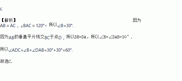 C 【解析】因为AB=AC,∠BAC=120°,所以∠B=30°. 因为AB的垂直平分线交BC于点D,所以DB=DA,所以∠B=∠DAB=30°. 所以∠ADC=∠B+∠DAB=30°+30°=60°. 故选C.