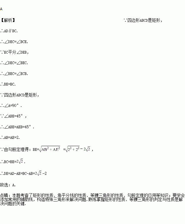 如图,在矩形ABCD中,点E在AD上,且EC平分∠BED,AB=2,∠ABE=45°,则DE的长为( )