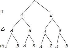 【答案】分析:本题应先算出三个同学去A或B地的可能性N,然后算出三个中两个去同一地的可能性M,用M除以N即可得出本题的答案.