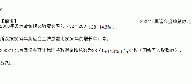 C 【解析】2004年奥运会金牌总数比2000年奥运会金牌总数增长率为(32﹣28)÷28=14.3%, 所以按2004年奥运会金牌总数比2000年的增长率计算, 2008年北京奥运会预计我国将取得金牌总数为28(1+14.3%)2≈37枚(四舍五入取整数). 故选C.