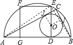 分析:连接EB、AE,OJ、OI,可得OHCI是正方形,且边长是4,可设BD=x,AD=y,则BD=BH=x,AD=AI=y,分别利用直角三角形ABC和直角三角形AEB中的勾股定理和相似比作为相等关系列方程组求解即可求得半圆的直径AB=21.
