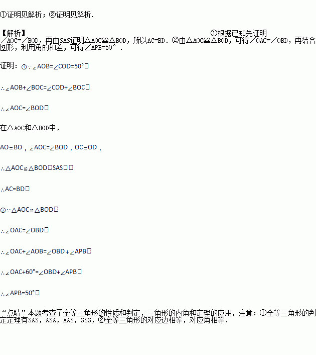 已知:如图,在△AOB和△COD中,OA=OB,OC=OD,∠AOB=∠COD=50°,