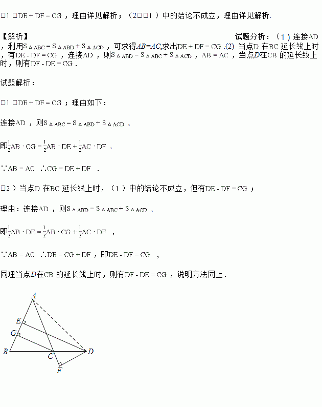 如图,在△ABC中,AB=AC,D是BC上任意一点,过D分别向AB、AC引垂线,垂足分别为E、F,CG是AB边上的高;