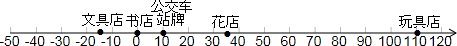 分析:(1)(2)首先根据题意画出数轴,表示出文具店、书店、花店、玩具店、公交车站牌的位置,可以直接得到的答案;