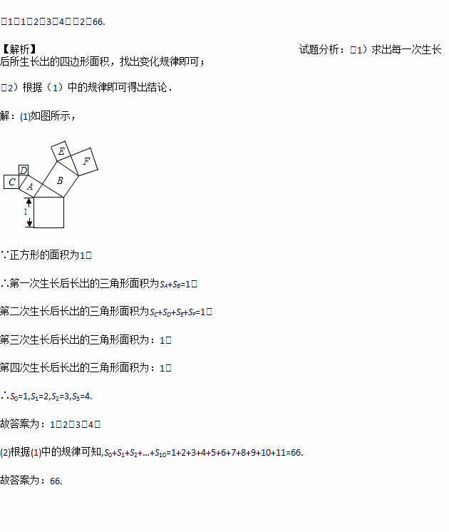 Èçͼ1£¬ÓÐÒ»¸öÃæ»ýΪ1µÄÕý·½ÐΣ¬¾¹ýÒ»´Î¡°Éú³¤¡±ºó£¬ÔÚËüµÄ×óÓÒ¼çÉÏÉú³öÁ½¸öСÕý·½ÐΣ¬Èçͼ2£¬ÆäÖУ¬Èý¸öÕý·½ÐÎΧ³ÉµÄÈý½ÇÐÎÊÇÖ±½ÇÈý½ÇÐΣ®ÔÙ¾¹ýÒ»´Î¡°Éú³¤¡±ºó£¬±ä³Éͼ3£»¡°Éú³¤¡±10´Îºó£¬Èç¹û¼ÌÐø¡°Éú³¤¡±ÏÂÈ¥£¬Ëü½«±äµÃ¸ü¼Ó¡°Ö¦·±Ò¶Ã¯¡±£®