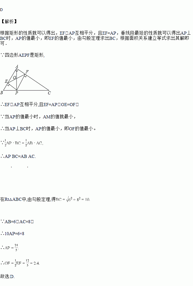 如图,在中,,,,是斜边上一动点,于,于,与相交于点,则的最小值为( )