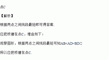 如图,A,B两个村庄在河m的两侧,连接AB,与m交于点C,点D在m上,连接AD,BD,且AD=BD.若要在河上建一座桥,使A,B两村来往最便捷,则应该把桥建在点C还是点D?请说明理由.