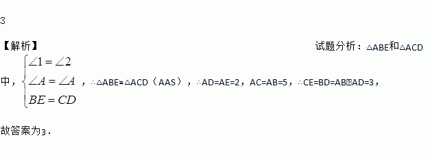 如图,在△ABC中,已知∠1=∠2,BE=CD,AB=5,AE=2,则CE=_____.